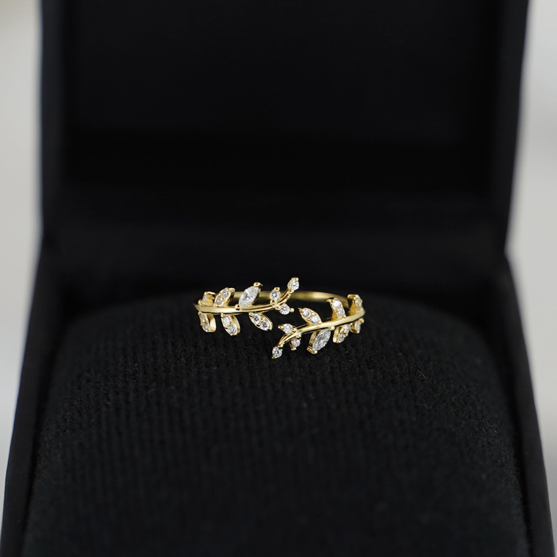 Gold on Sterling Silver CZ Leaf Feather Bridal Wrap Ring Adjustable