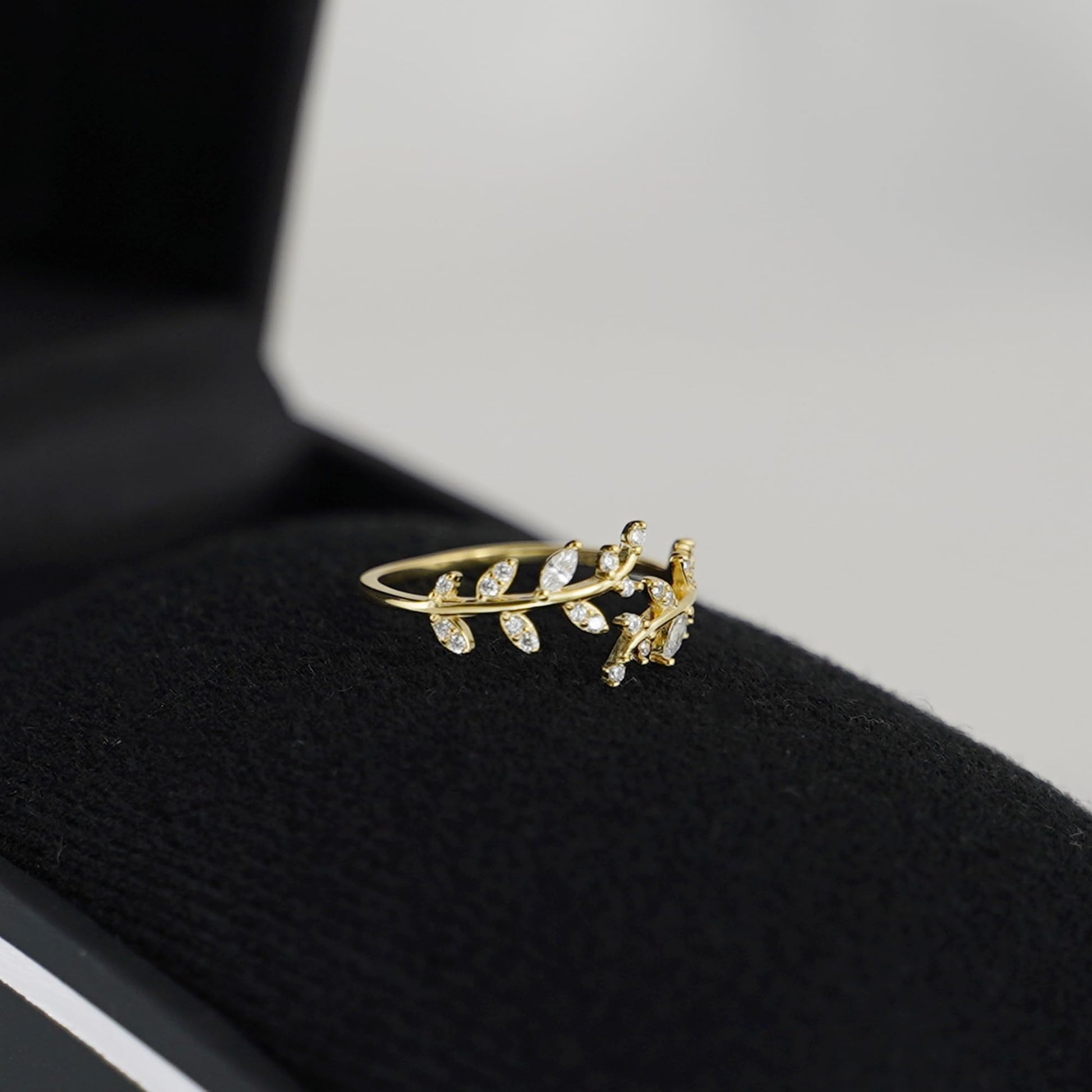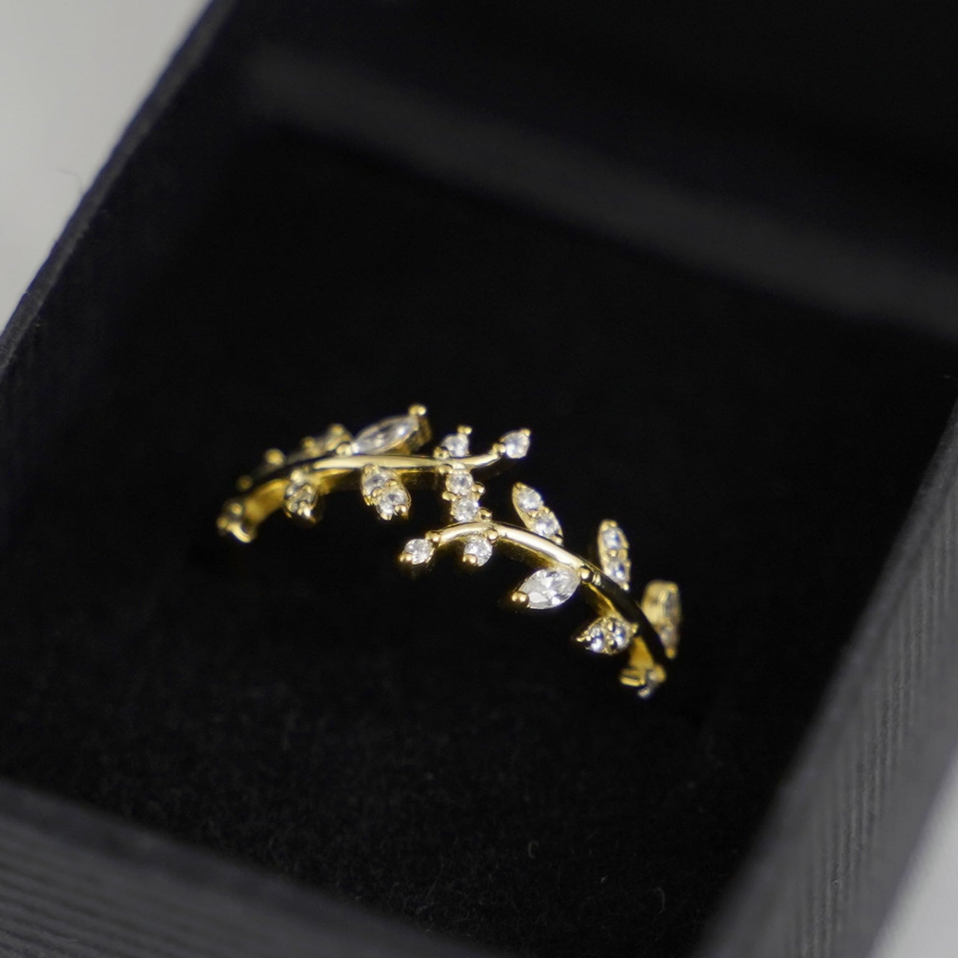 Gold on Sterling Silver CZ Leaf Feather Bridal Wrap Ring Adjustable - Boxed