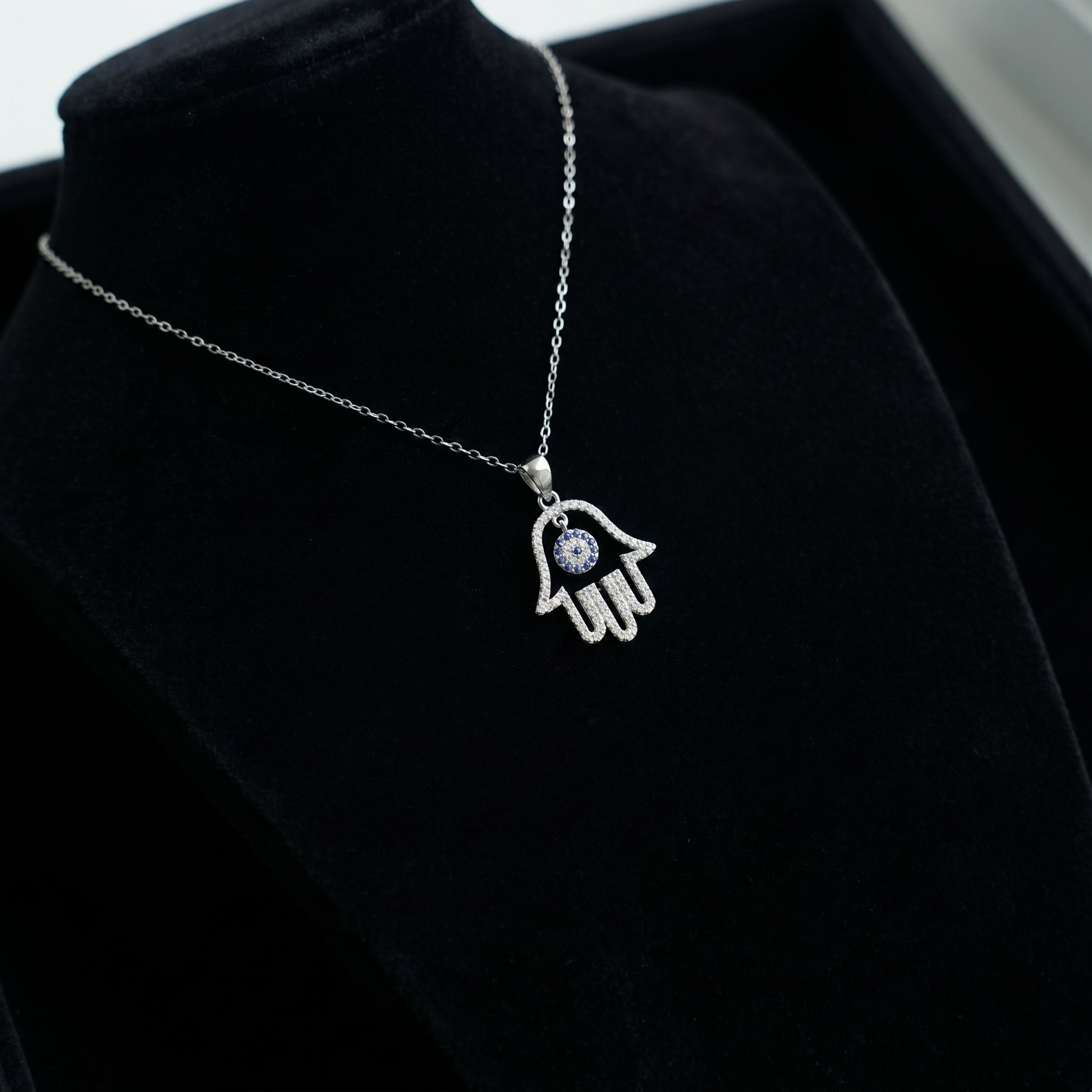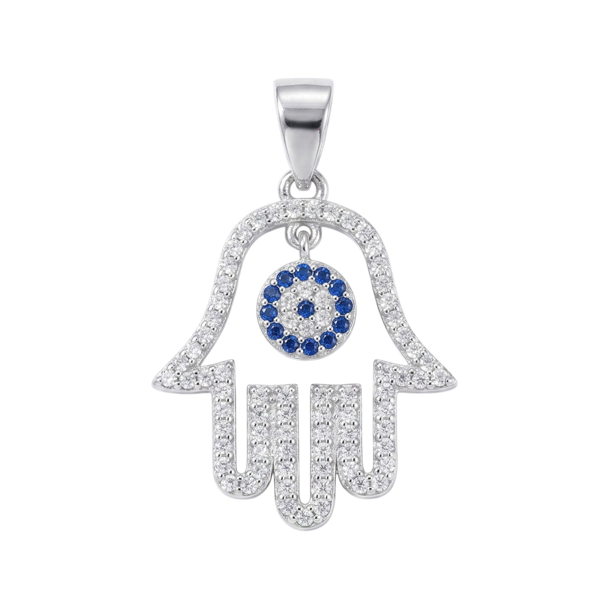 This sterling silver pendant features a hollow Hamsa hand (Hand of Fatima) design set with blue pavé cubic zirconia in an evil eye motif, finished with rhodium plating for a smooth surface. It is supplied gift boxed.