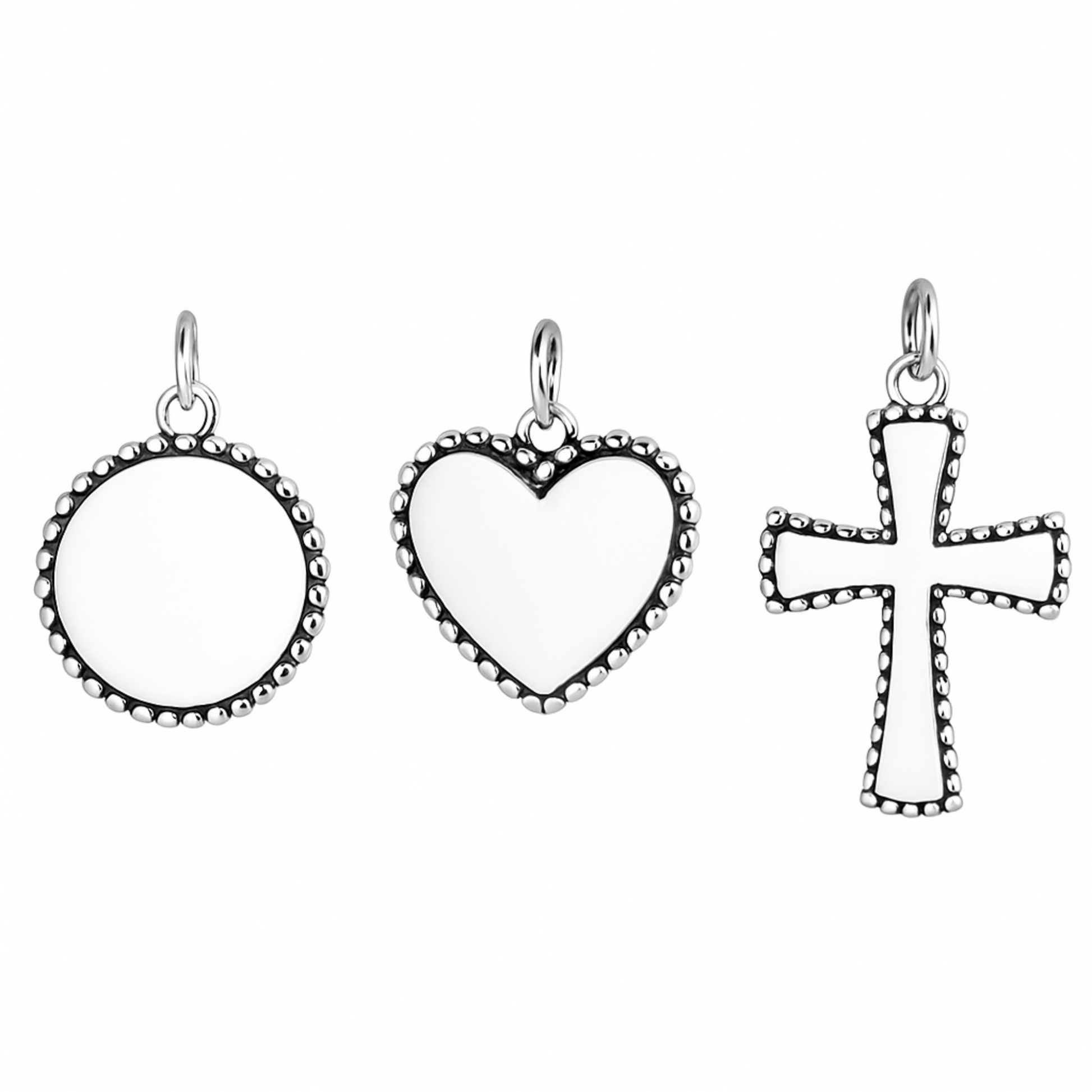 Sterling Silver 11mm Shiny Beaded Edge Charm Cross / Heart / Circle Pendant
