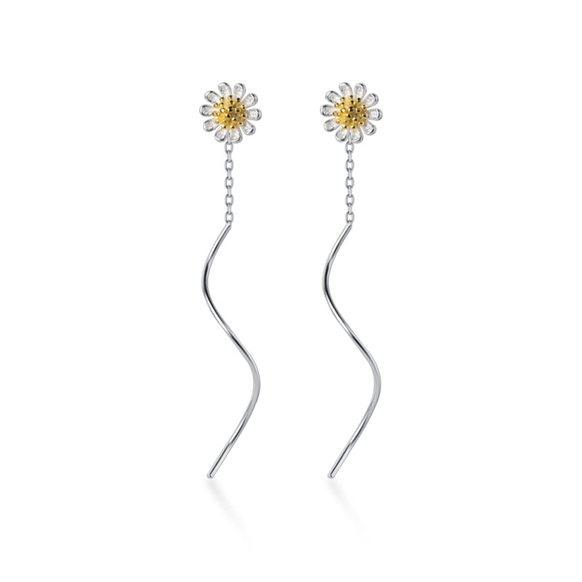 Sterling Silver Daisy Floral Pull Through Long Wave Threader Earrings