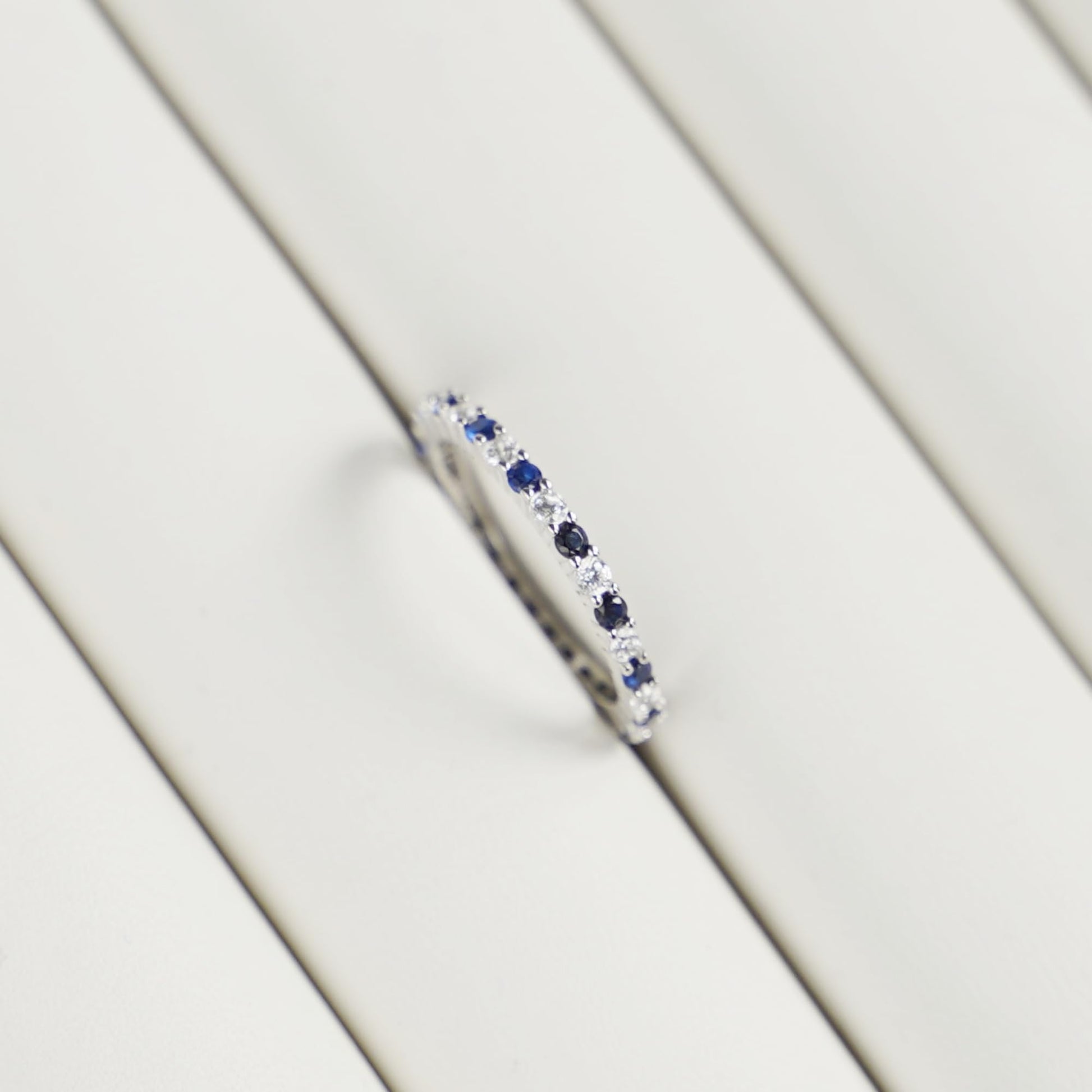 Sterling Silver Full Eternity 2mm Shared Prong Set CZ White Blue Sapphire Band Ring Boxed Item Specifics: Ring Size: UK Size L1/2 (US 6), O ( US 7.2), Q (US 8), R1/2 (US 8.8) Band Thickness: 2mm Band Width: 2.6mm Weight: 1.6g - 1.8g Composition: sterling silver stamped Surface: rhodium plating