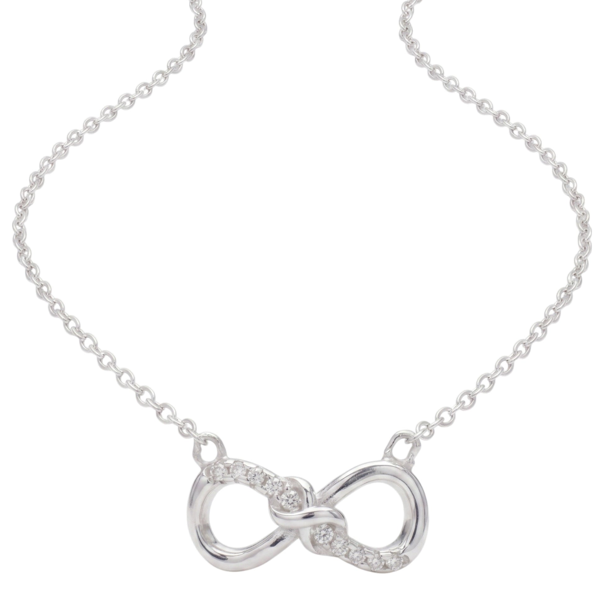 This sterling silver necklace features an infinity knot design set with cubic zirconia, finished with rhodium plating for a smooth and polished surface. It is supplied in a cotton-filled gift box.