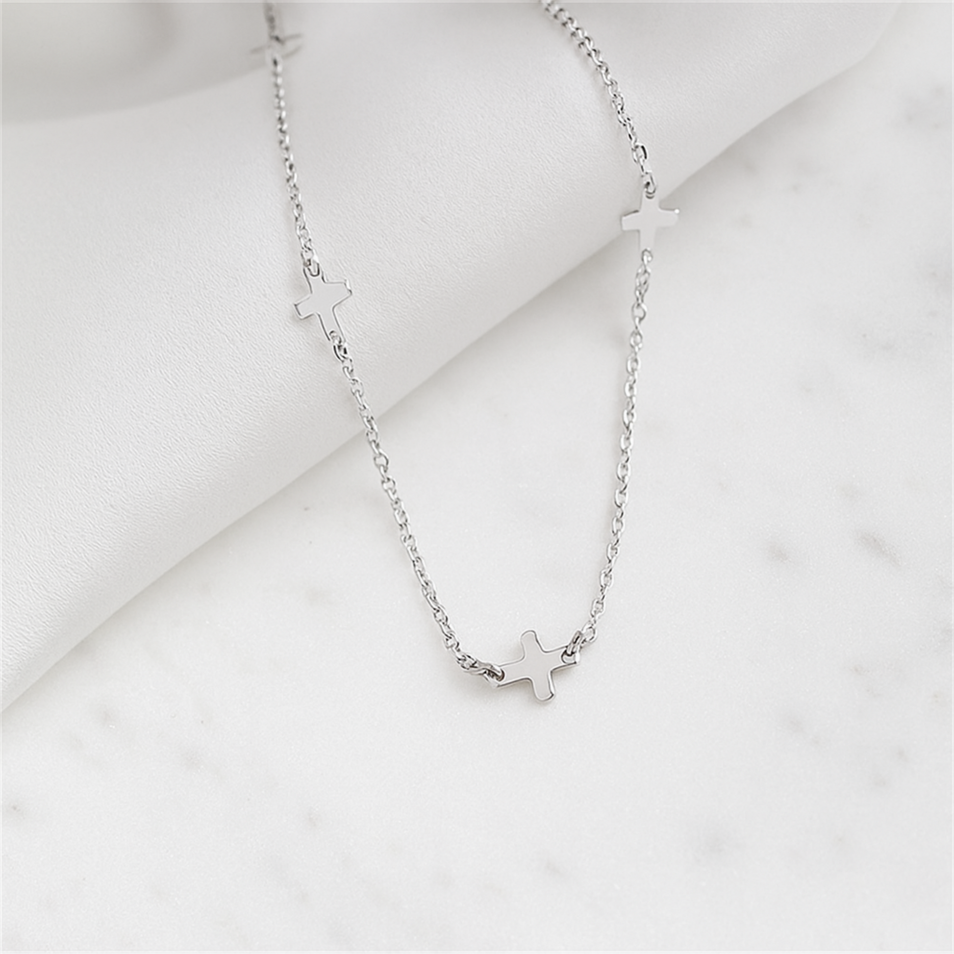 This dainty sterling silver multi cross necklace is a stylish and meaningful way to express your faith. The necklace features a delicate chain with three small, horizontal crosses that are sideways. The crosses are made of 925 sterling silver and are rhodium-plated to give them a bright, white finish. The necklace is lightweight and comfortable to wear, and it comes in a gift box, making it a perfect gift for any occasion.