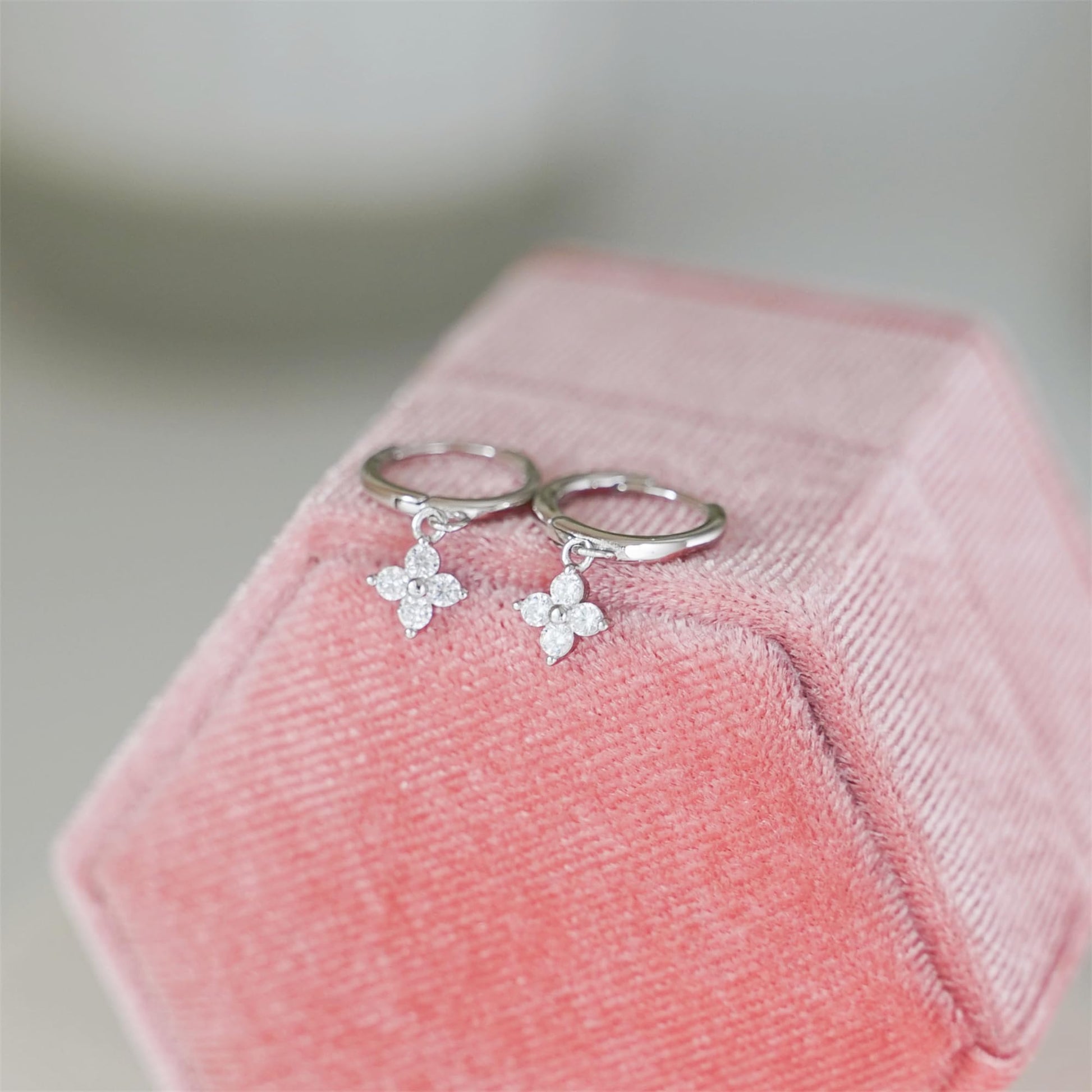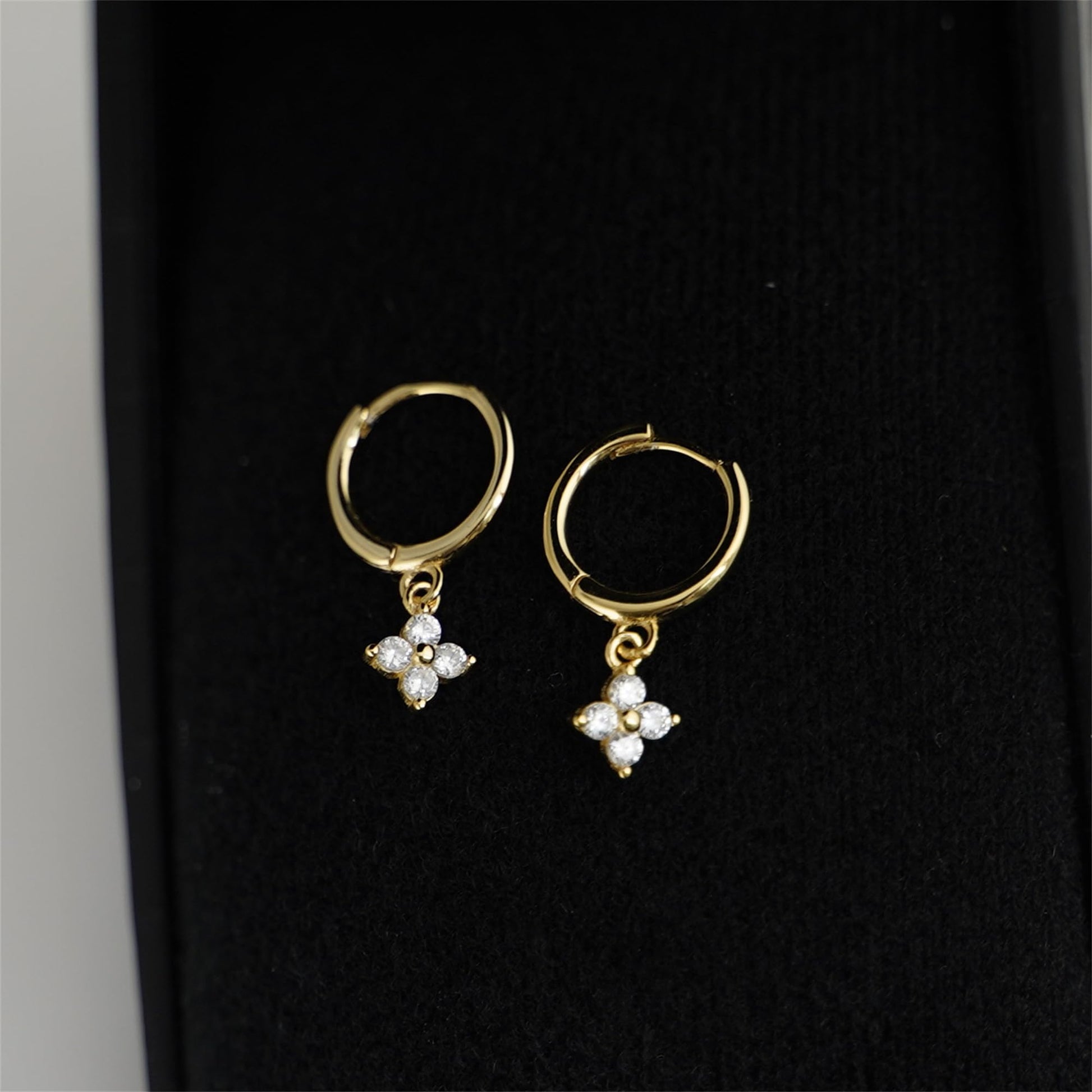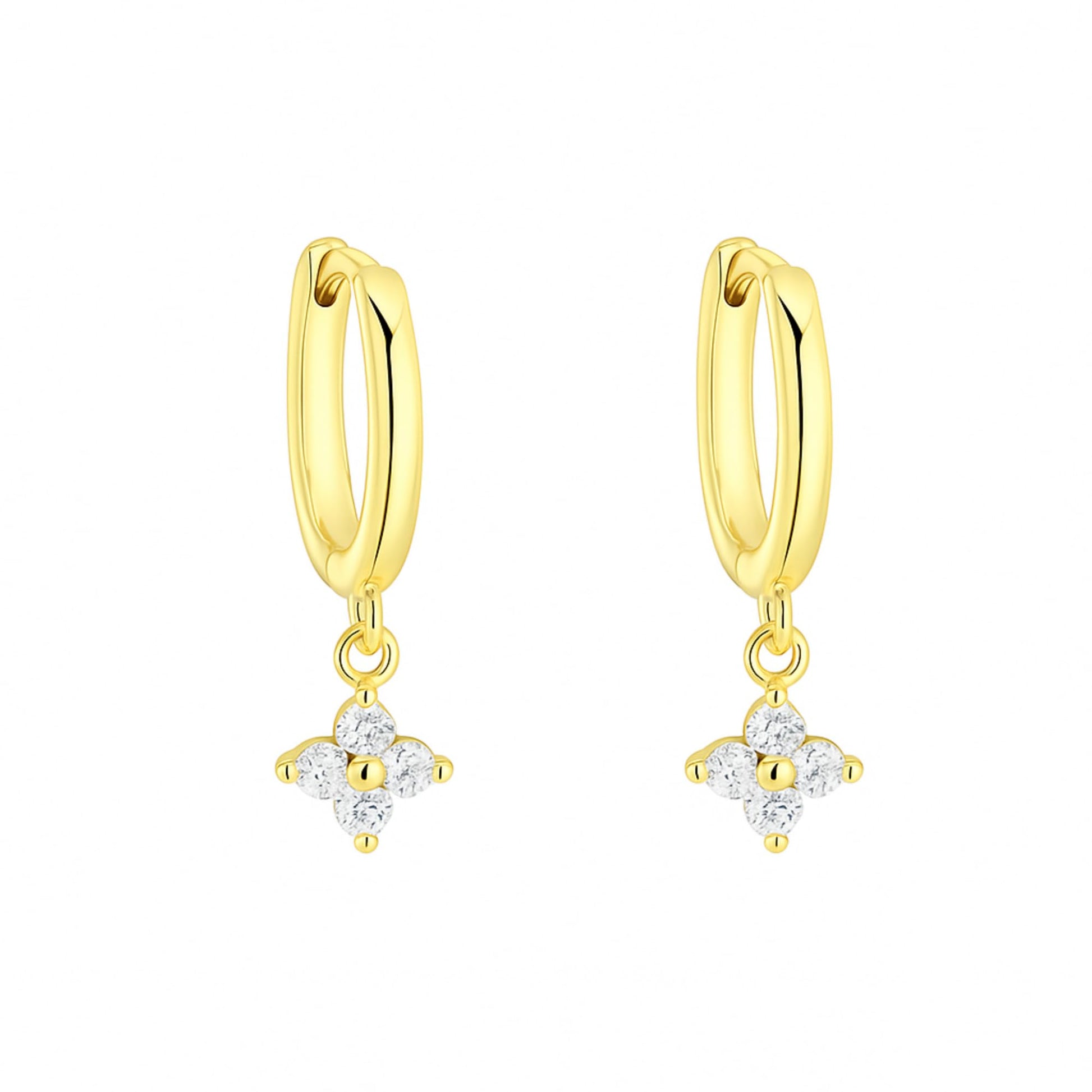 Sterling Silver Motif Flower Charm CZ Hinged 9mm Hoop Huggie Earrings- Boxed ITEM SPECIFICS: Hoop Size: 9mm inside diameter, 12mm outside diameter, 1.5mm hoop thickness Full Length: 22mm Charm Size: 6*6mm (L*W) Total Weight: 1.8g Metal: 925 Sterling Silver Stamped Surface: 18K Gold and Rhodium