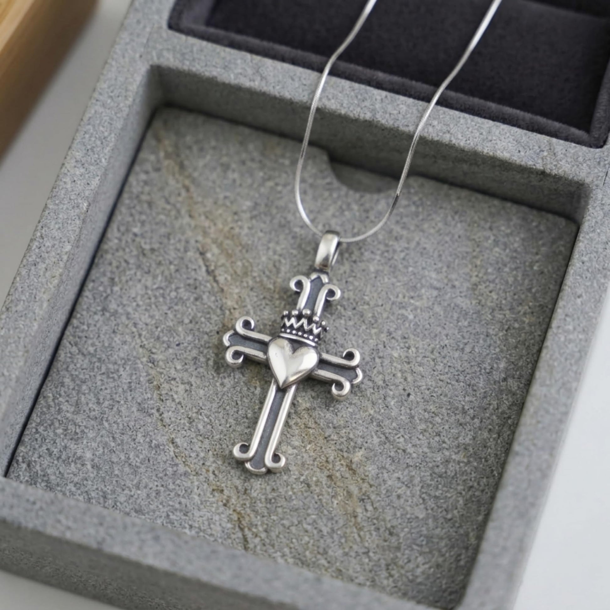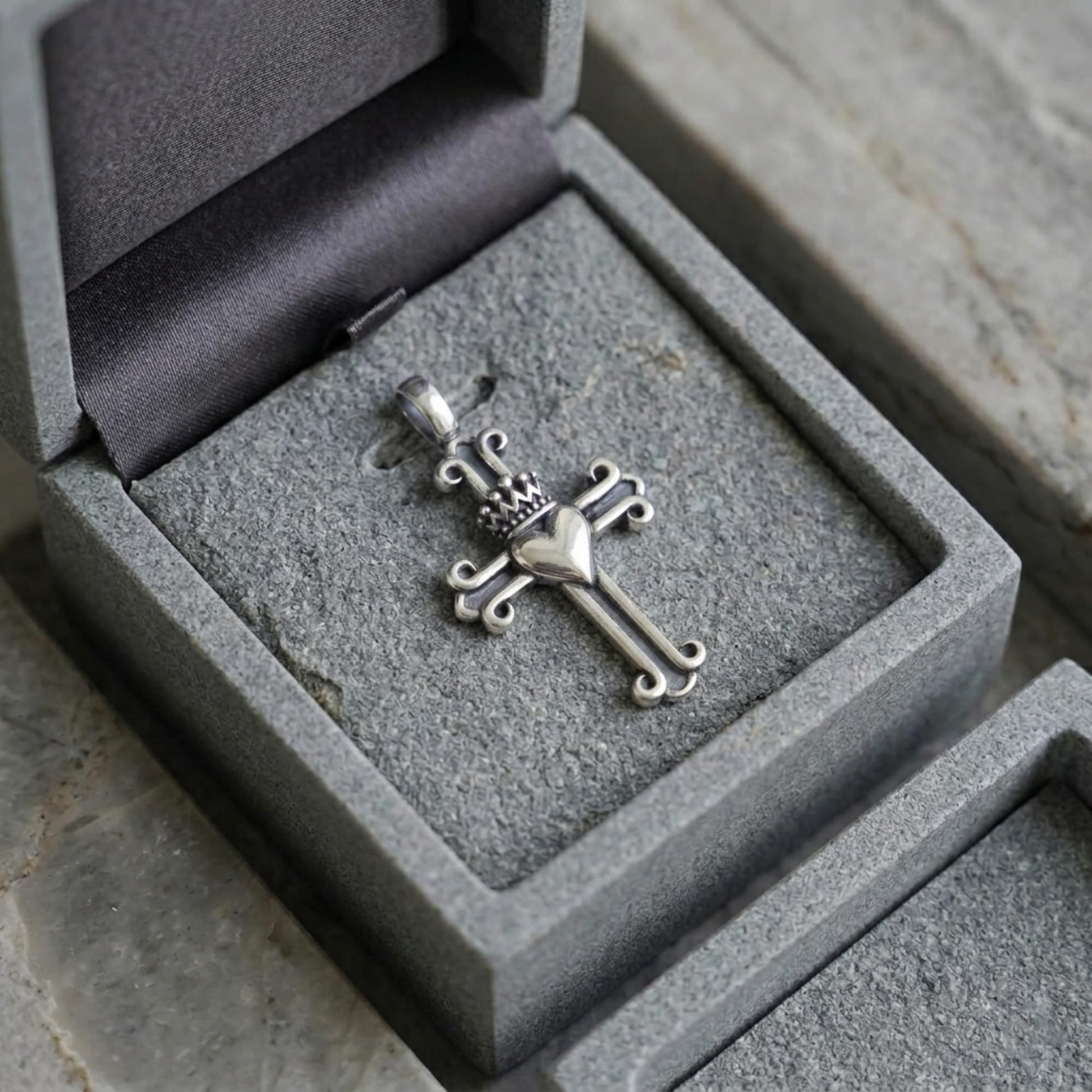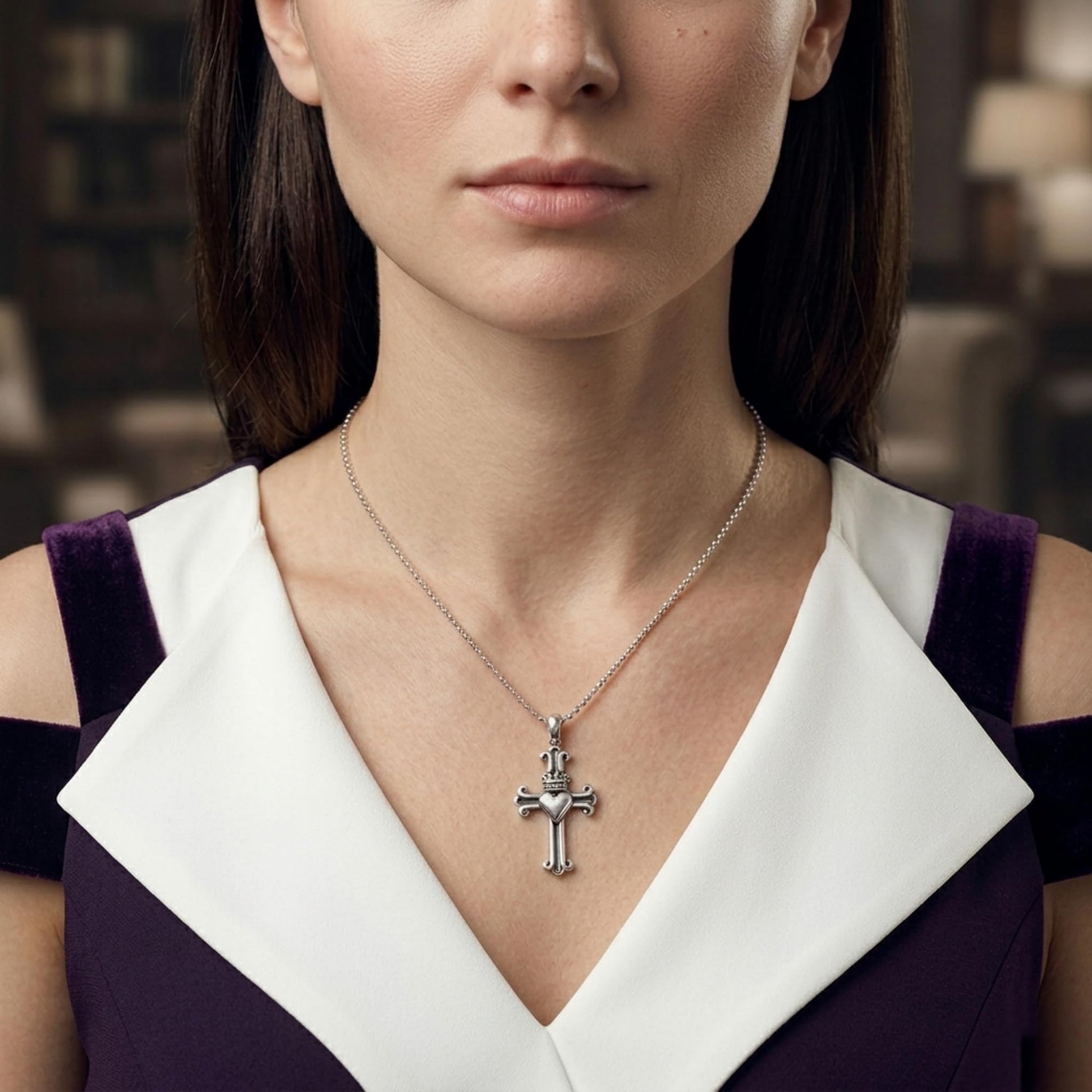 Sterling Silver Oxidised Fleury Claddagh Cross Pendant Heart Crown Love Symbol