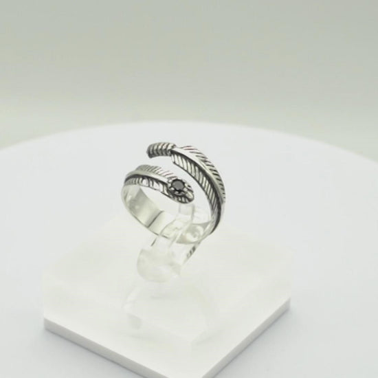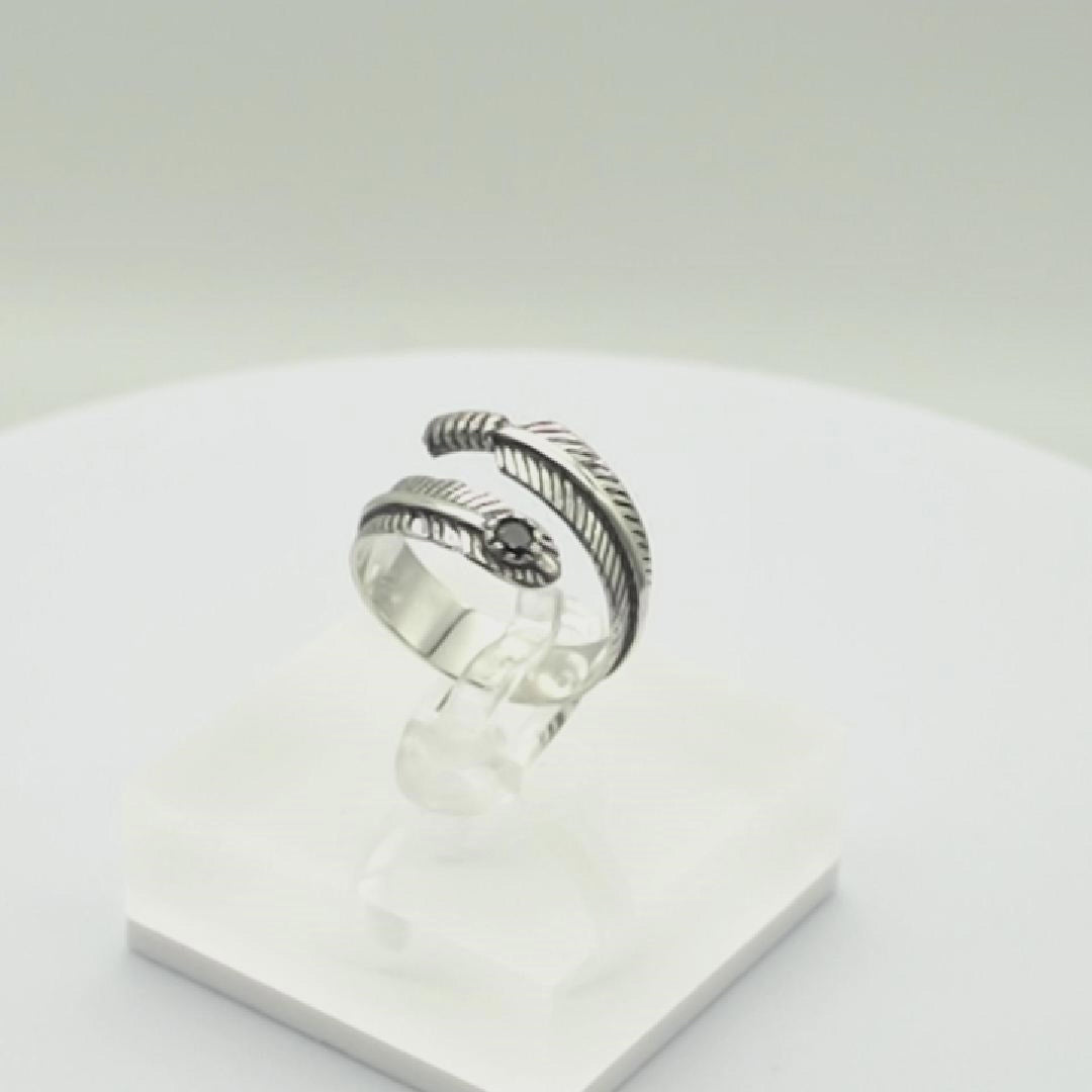 Sterling Silver Oxidized Black CZ Leaf Feather Angel Wing Wrap Ring Unisex - Boxed