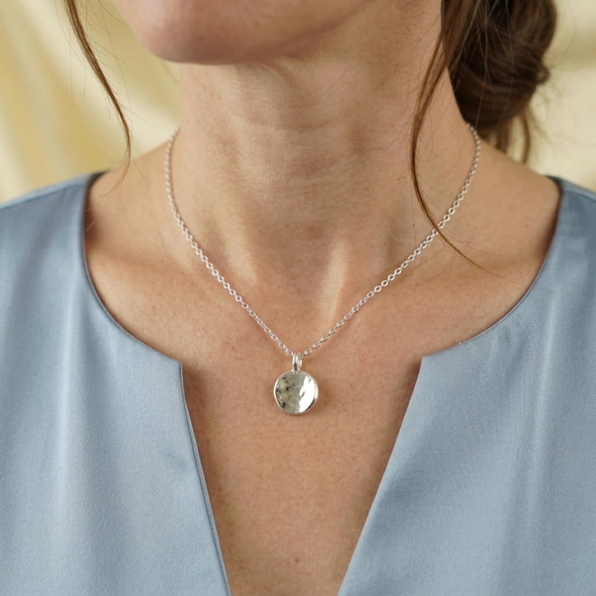 Sterling silver concave hammered round disc charm pendant, perfect for necklaces and jewellery making. Lightweight with a textured pebble-style finish, ideal for minimalist or layered designs.